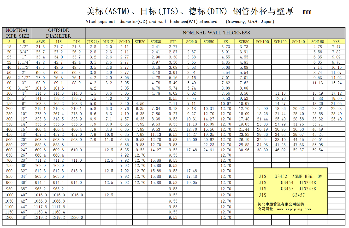 美标(ASTM)、日标(JIS)、德标(DIN) 钢管外径与壁厚 mm