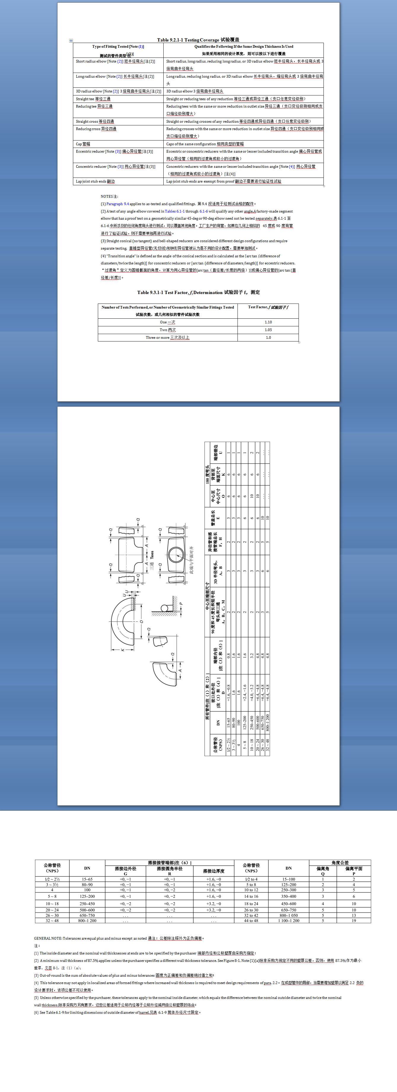 48 and thickness ranges in accordance with para. 9.4.2. 注:不同尺寸和壁厚的几何形状相同的管件的试验, 其重叠范围如段 9.4 所述。可以结合段 9.4 以确定适用于一套管件的测试系数。例如,测试具有相同的基本设计配置和制造方法口径为 nps2、nps8 和 nps24 的管件,可以获得 1.0 的测试因子,可以根据第 9.4.2 节确定壁厚覆盖范围,口径覆盖范围从NPS 1 到 NPS 48