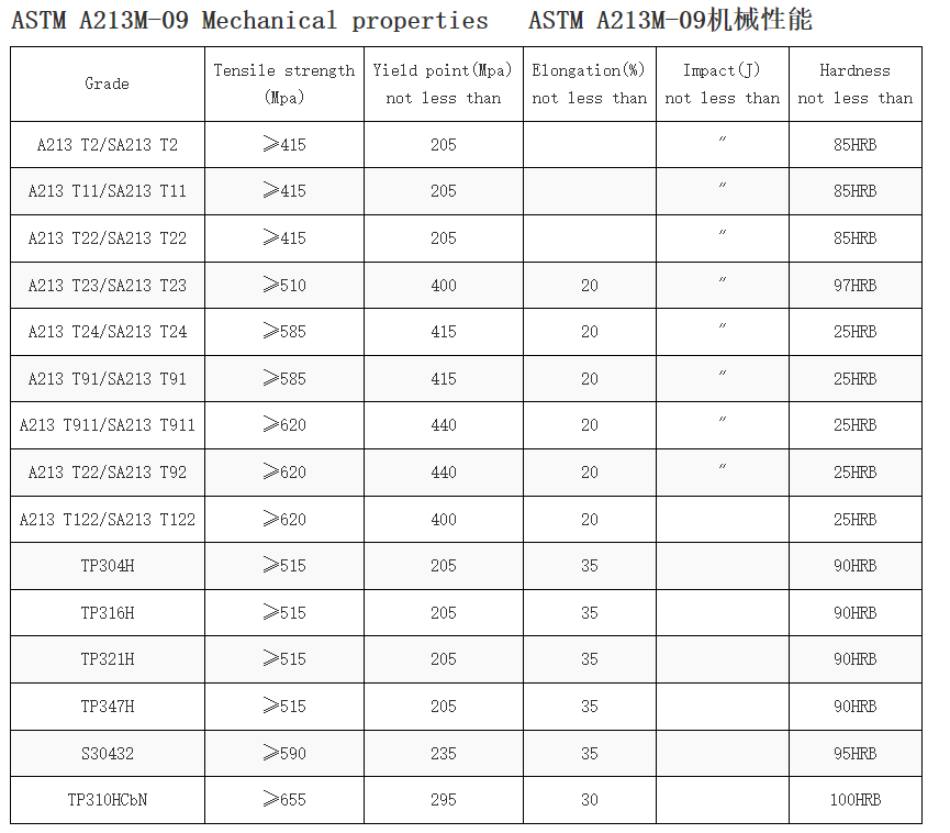ASTM A213/A213M规范涵盖了无缝铁素体和奥氏体钢锅炉、过热器和换热器管。在其名称中包含字母H的等级的要求与不含字母H的类似等级的要求不同。这些不同的要求提供了比没有这些不同要求的类似等级通常可达到的更高的蠕变断裂强度。管子应采用无缝工艺制造,并应按规定进行热加工或冷加工。TP347HFG级应进行冷加工。除了热成型加热外,热处理应单独进行。铁素体合金和铁素体不锈钢应重新加热。另一方面,奥氏体不锈钢管应在热处理条件下提供。或者,在热成型后,当管的温度不低于最低溶液温度时,管可以单独在水中淬火或通过其他方式快速冷却。应对每根管子进行拉伸试验、硬度试验、压扁试验和扩口试验。此外,每根管子都应进行无损电试验或水压试验。