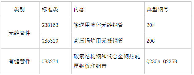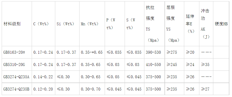 目前碳钢对焊管件,国内制造标准比较繁多,主要涉及国家标准GB12459、GB/T13401及行业标准,如:SH3408 、SH3409、HG/T21635 、HG/T21631以及电力、石油等行业标准,但从其使用材料的类别来分,不外乎两类,一类用于制造无缝管件的无缝钢管类,另一类用于制造焊缝管件的钢板类。最常用的这两类材料的标准见表1,其中用于碳钢对焊管件的典型材料为:GB8163-20#、GB5310-20G 及 GB3274-Q235A、Q235B,这几种材料的主要化学成份及机械性能标准要求见表2。