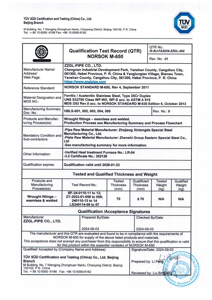 公司已通过挪威国家石油标准NORSOK M-650 ASTM A815 UNS S32750认证。
