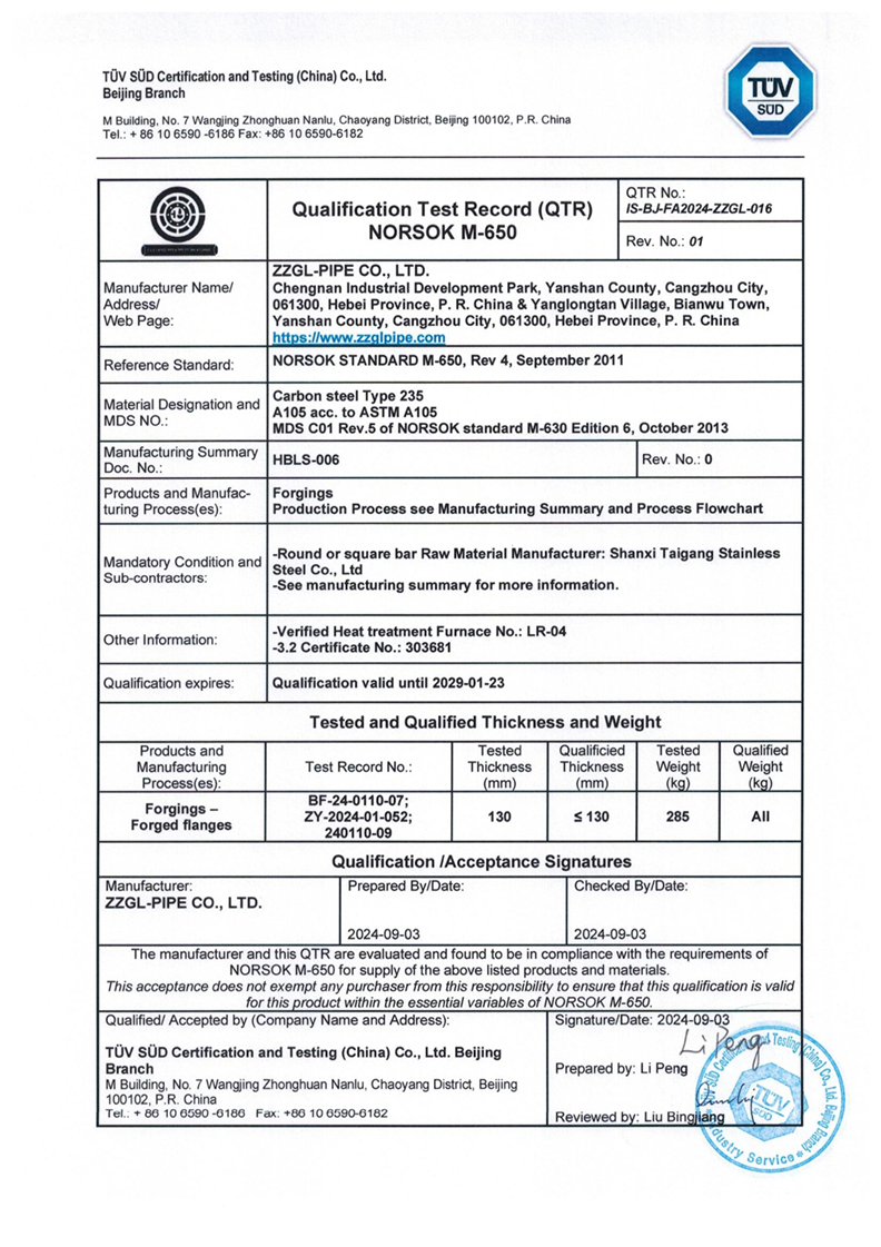 公司已通过挪威国家石油标准NORSOK M-650 ASTM A105 认证。
